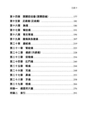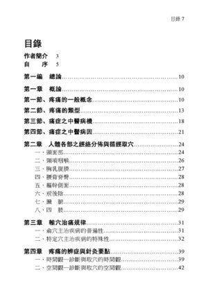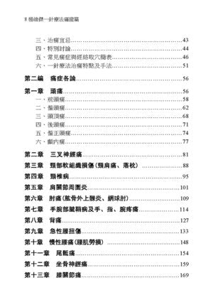 下過功夫懂得針灸的人,都知道只要認識病理熟悉針理,往往一針就能解決痛苦,而且不必針剌患處,既是技術也是藝術。楊醫師對痛症下過極大功夫,既遵古法傳統取穴,且不針痛處,並進而研創出具有其個人特色的「一針療法」。就是遠處取穴,並以四肢為主,方便而安全,尤其重要的是有效。這本書分為「總論」及「各論」兩大部分,「總論」介紹疼痛的類型、病機、診斷,其次介紹了針灸治療痛症的總規律。「各論」介紹各種疼痛,自四肢以至內臟,以至五官之各種疼痛。臨床常會遇見的痛證都已包括在內,每種疼痛的治療都介紹了多組的特效一針,每個一針也都作了所以有效原理的解說。取穴有原理根據,則不但給應用者加強信心,並得以就臨床狀況靈活選擇適合病證的特效一針。